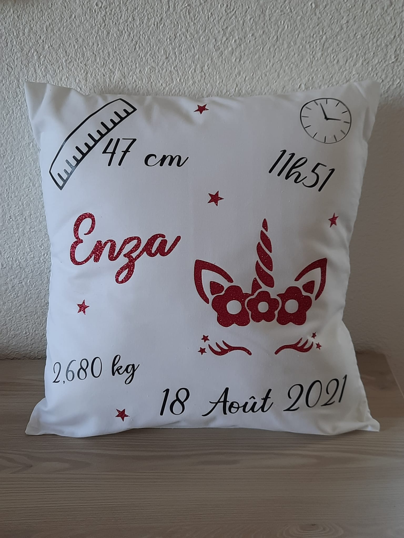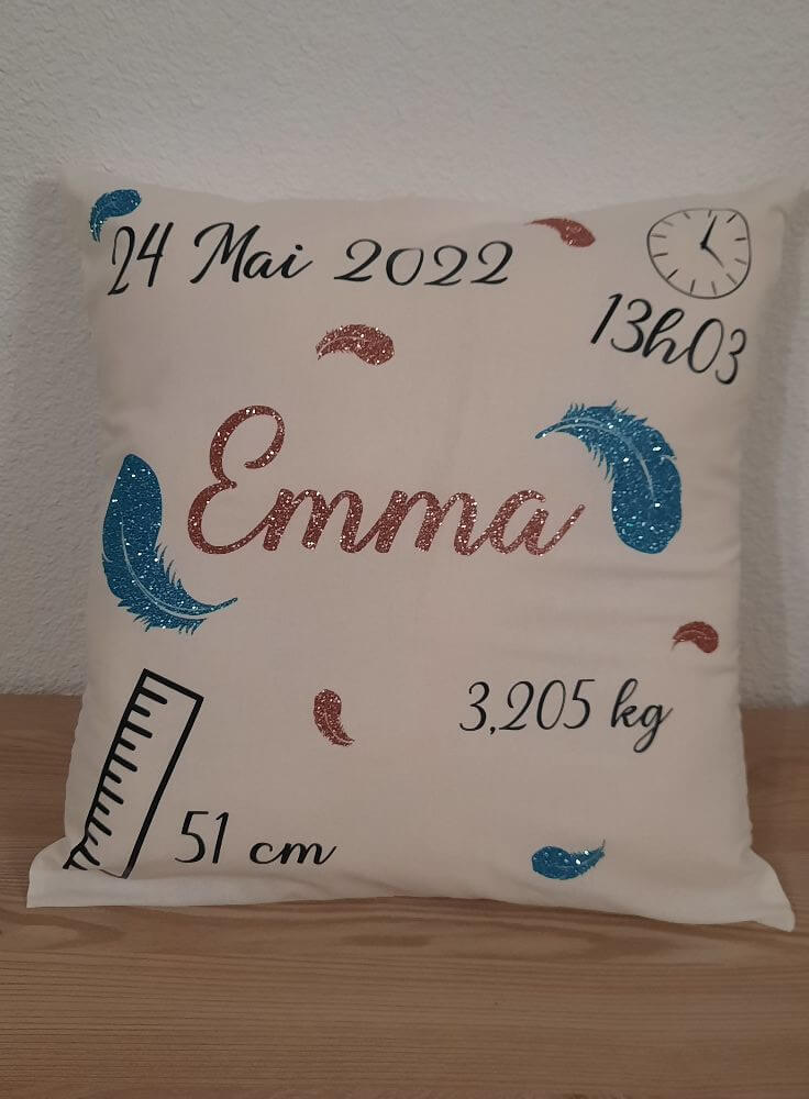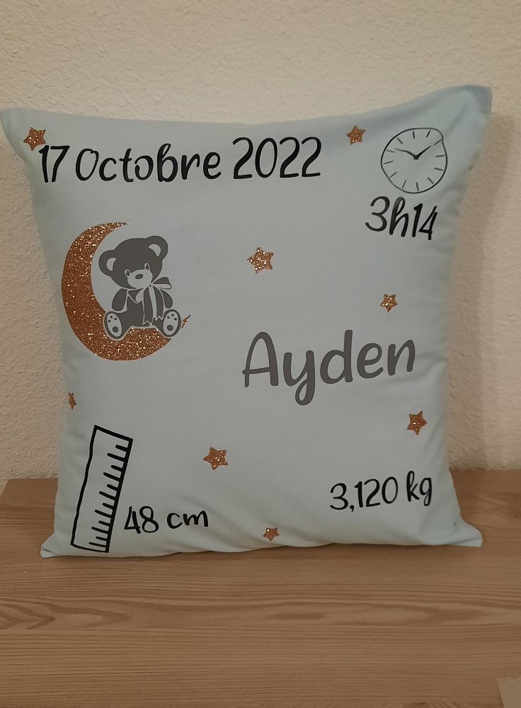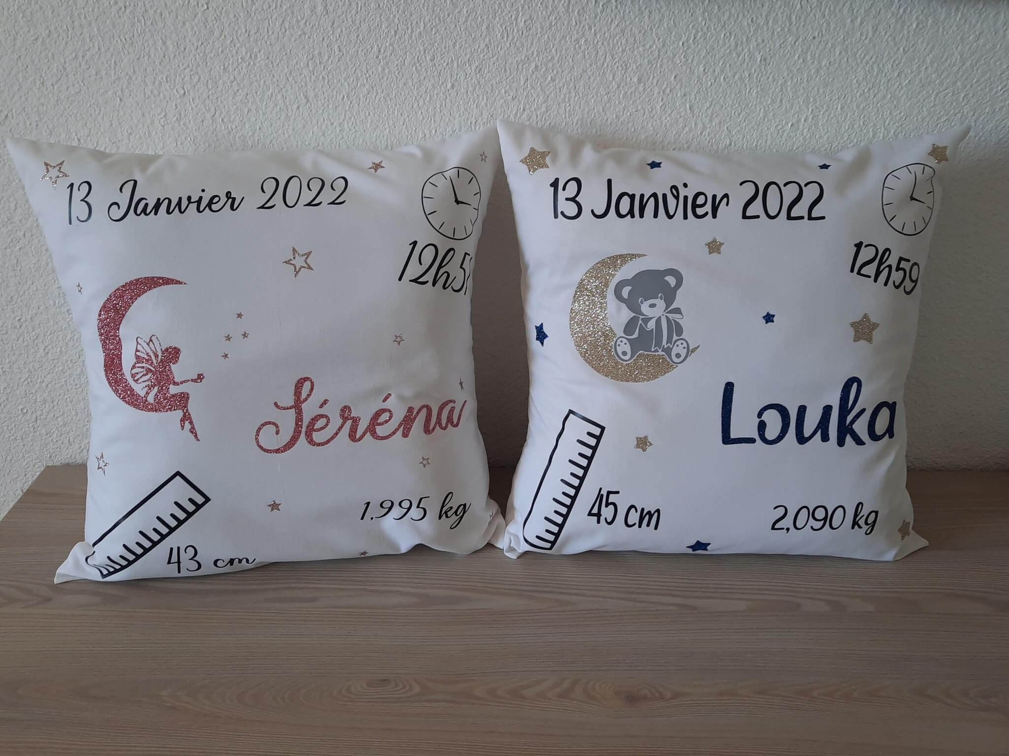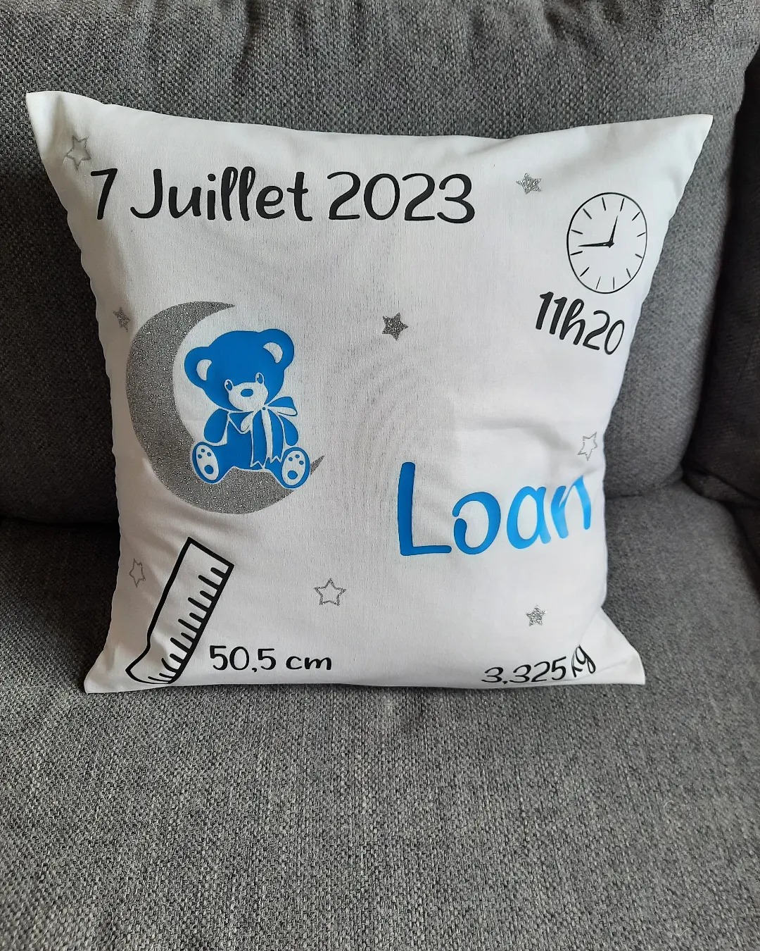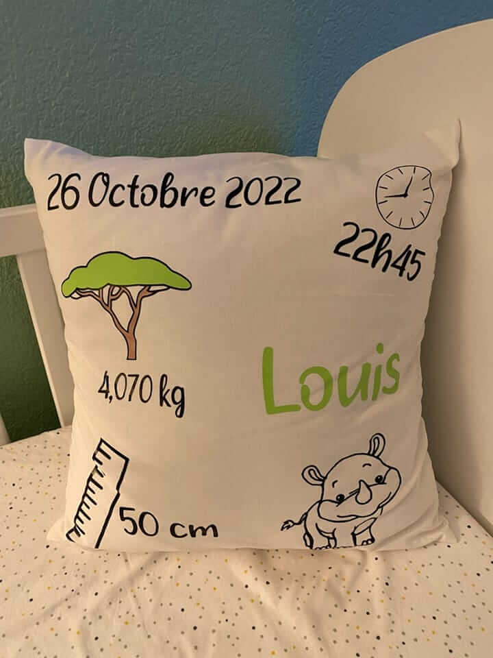 Célébrez l’arrivée de bébé avec un coussin de naissance unique, entièrement réalisé à la main. À la fois décoratif et rempli d’émotion, ce coussin personnalisé reprend les informations de naissance de votre enfant. Le thème et les couleurs sont adaptés à l’univers de sa chambre pour une création parfaitement harmonieuse.